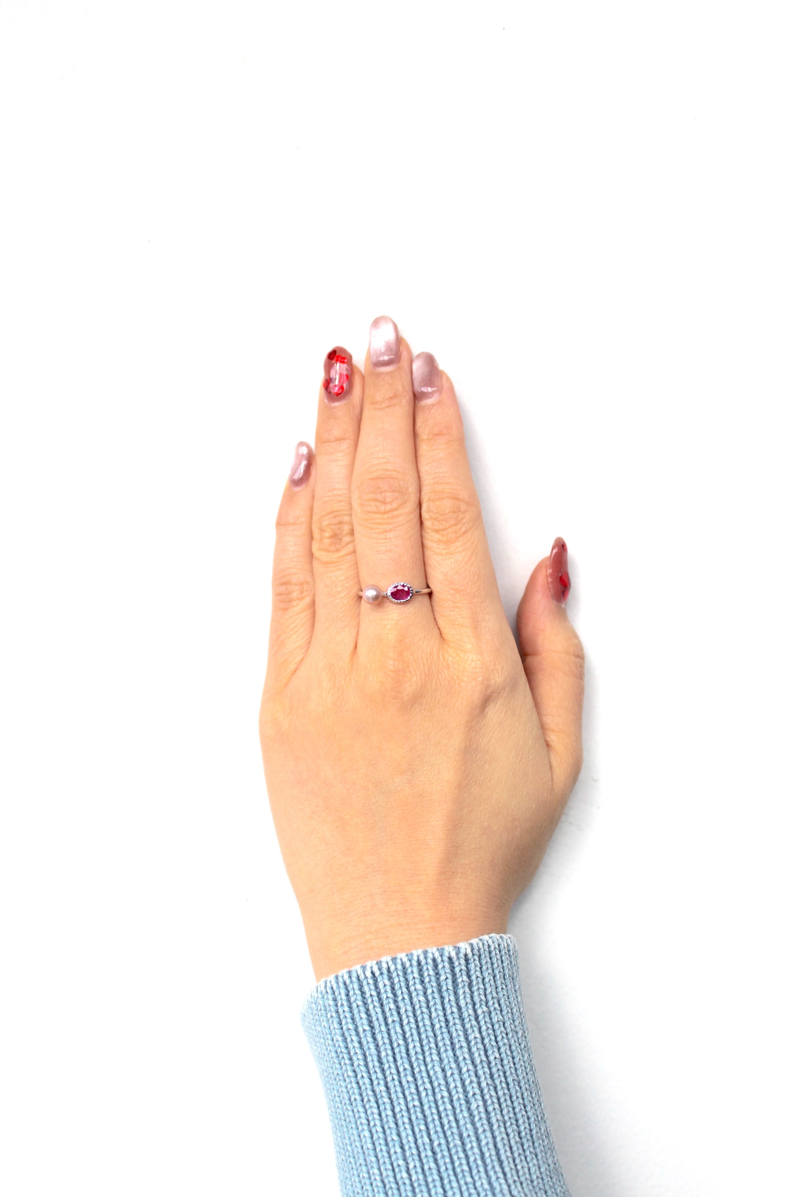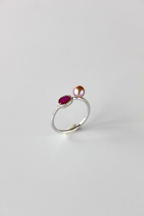 指に着けた時の真珠と天然石の絶妙なバランスが特徴で、差し色として存在感があり抜群の可愛さ
